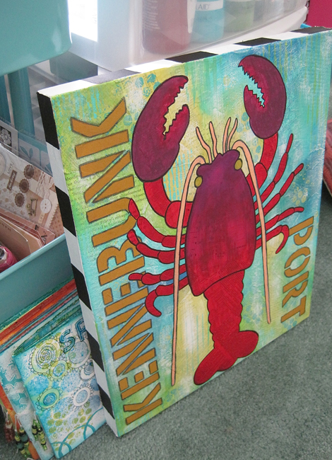 Using inspiration from my art journal, I sketched the lobster onto the collaged background.